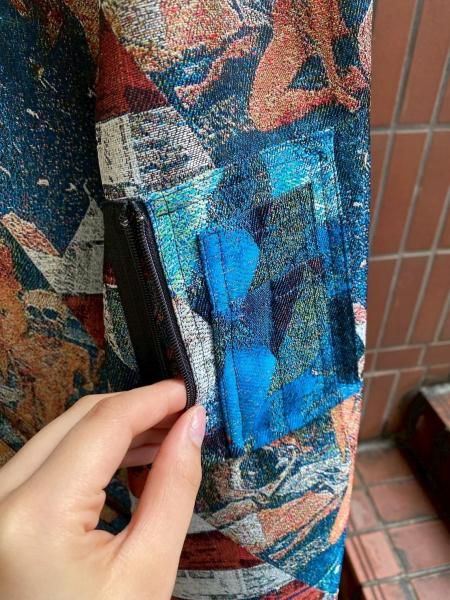左袖にユーティリティポケット、後ろには大きなファスナー付きポケット仕様。