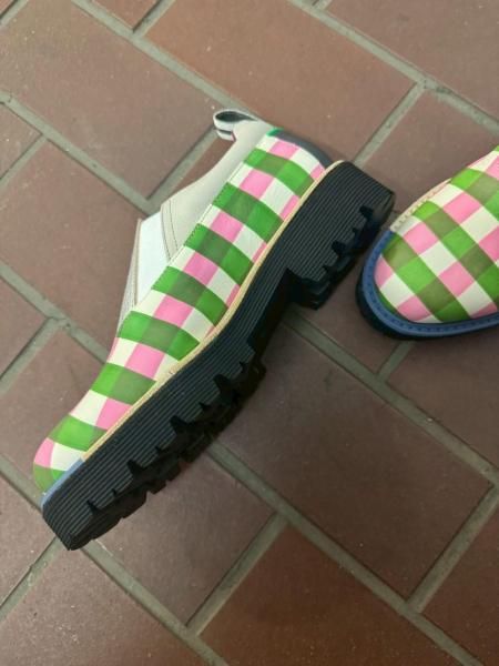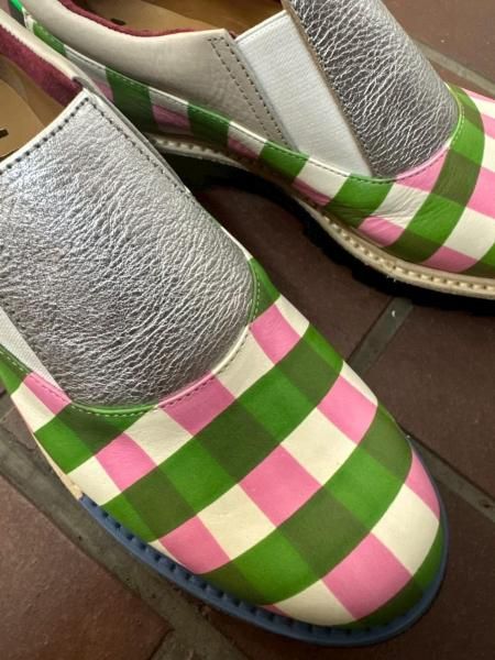 透け感のある手描きチェックのレザーにキラッと光るシルバーレザー、履き口にはピッグスエードのボルドーを合わせて、とびきり遊び心あるカラーリングに。