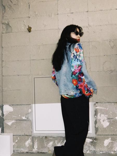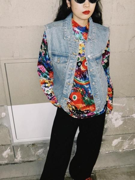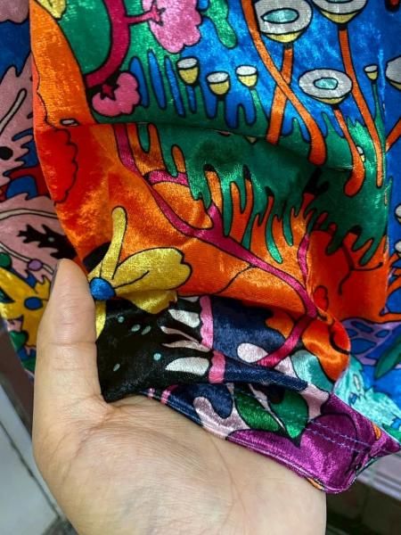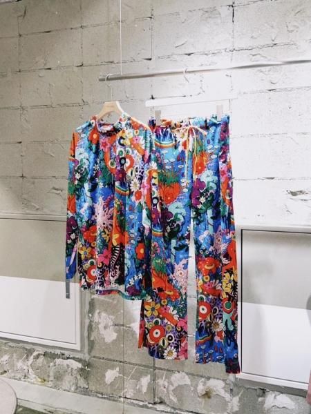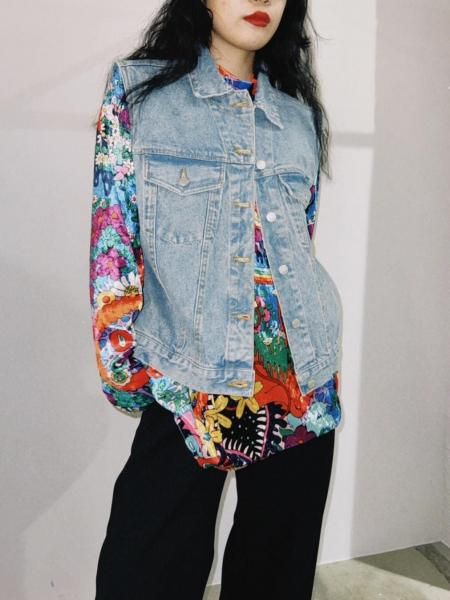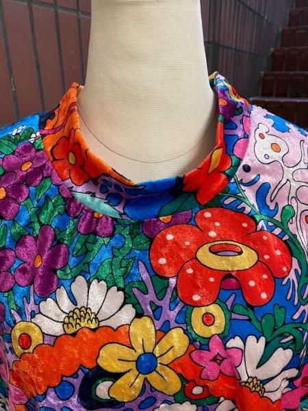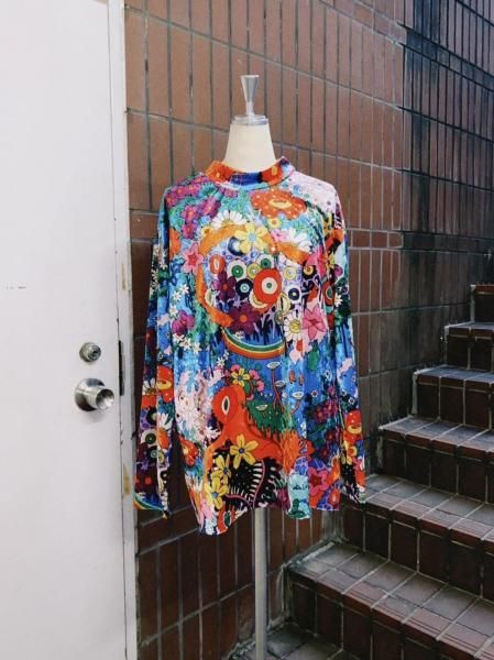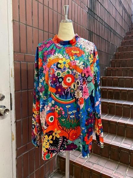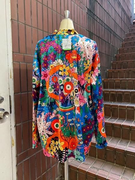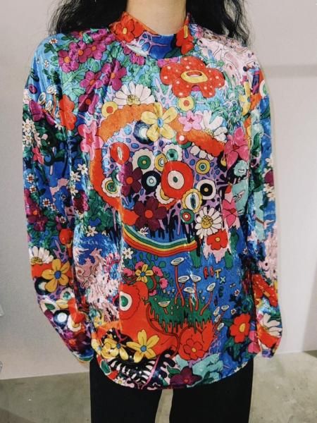 アーティスト冬耳(fuyuji)の原画をトレースしたサイケデリックなフラワー柄をプリントしたレトロな1着。
